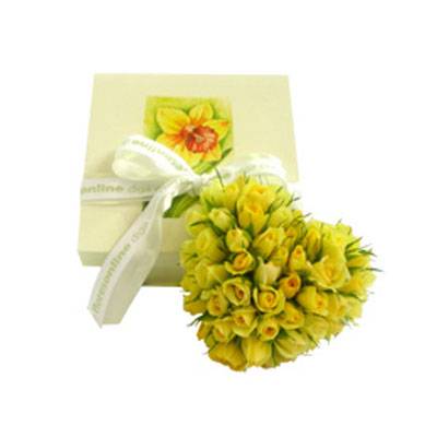 | Puro charme... Arranjo com um delicado coração de mini rosas amarelas em caixinha de madeira branca com detalhe na tampa e laço de fita. |